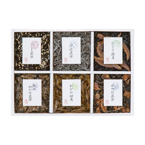 ■商品紹介内容/ごま昆布:45g×1・汐吹昆布:20g×1・かつお昆布:20g×1・ひじき椎茸:45g×1・わかめ佃煮:45g×1・鰹入わかめ昆布:50g×1《小麦》