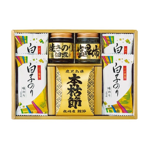 ■商品紹介内容/鹿児島県枕崎産鰹本枯れ節:2.5g×2袋×1・白子のり味のり:8切5枚×4・塩昆布:18g×1・焼きのり佃煮:85g×1《小麦・えび》