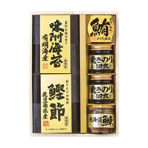 ■商品紹介内容/鰊フレーク:50g×1・焼きのり佃煮:85g×2・鹿児島県産鰹節:2g×3袋×1・有明海産味付け海苔8切10枚×1・まぐろ油漬け:70g×1《小麦・えび》