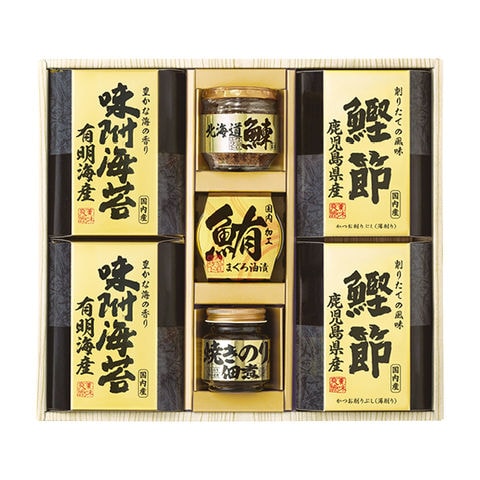 ■商品紹介内容/鰊フレーク:50g×1・焼きのり佃煮:85g×1・鹿児島県産鰹節:2g×3袋×2・有明海産味付け海苔8切10枚×2・まぐろ油漬け:70g×1《小麦・えび》
