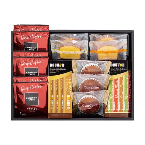 ■商品紹介内容/エクセルシオールカフェドリップコーヒー(モカブレンド)×6・ドトールインスタントスティック抹茶オレ×2・ドトールインスタントスティックカフェラテ×2・ドトールインスタントスティックロイヤルミルクティー×2・ドトールインスタントスティックカフェオレ×4・カップケーキ(メープル)×3・カットケーキ(レモン)×2・カットケーキ(オレンジ)×2《卵・乳・小麦》