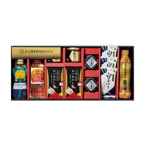 ■商品紹介内容/のり佃煮:80g×2・鮭ほぐし:50g×2・かつおだし:4g×8袋×2・伊賀越天然醸造醤油:450ml×1・昭和キャノーラ油:300ml×1・白子だし塩のり:8切5枚×3・日の出割烹みりんタイプ:400ml×1《乳・小麦》