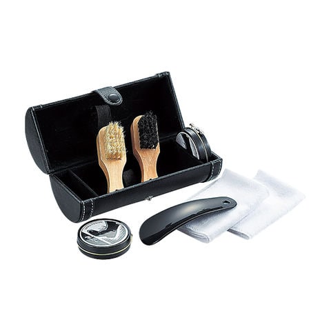 材質/ケース:合成皮革、靴クリーム:ロウ・油脂・有機溶剤、布:綿、ブラシ:豚毛・天然木、靴べら:ABS樹脂