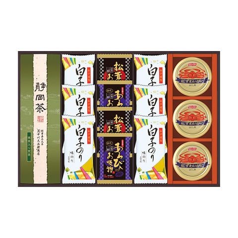 ■商品紹介内容/紅ずわいがにほぐし身:55g×3・抹茶入り煎茶:80g×1・あわび入お吸い物:4g×2・松茸入りお吸い物:4.2g×2・白子のり:8切5枚×6《卵・乳・小麦・えび・かに》