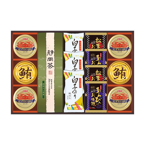 ■商品紹介内容/紅ずわいがにほぐし身:55g×4・鮪油漬フレーク:70g×2・抹茶入り煎茶:80g×1・あわび入お吸い物:4g×2・松茸入りお吸い物:4.2g×2・白子のり:8切5枚×3《卵・乳・小麦・えび・かに》
