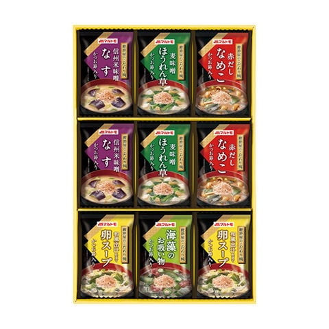 ■商品紹介内容/みそ汁なす:8.5g×2・みそ汁なめこ:6.6g×2・みそ汁ほうれん草:8.7g×2・スープ(卵):7.6g×2・海藻のお吸い物:4g×1《卵・小麦》
