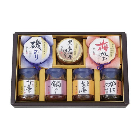 ■商品紹介内容/磯のり:90g×1・黒毛和牛肉みそ:90g×1・梅かつお:90g×1・柚子風味なめ茸:85g×1・鯛みそ:100g×1・刻み生姜煮:90g×1・かにのり佃煮:90g×1《乳・小麦・かに》