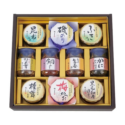 ■商品紹介内容/昆布佃煮:70g×1・磯のり:90g×1・ふき佃煮:50g×1・柚子風味なめ茸:85g×1・鯛みそ:100g×1・刻み生姜煮:90g×1・かにのり佃煮:90g×1・椎茸ふくめ煮:85g×1・梅かつお:90g×1・黒毛和牛肉みそ:90g×1《乳・小麦・かに》