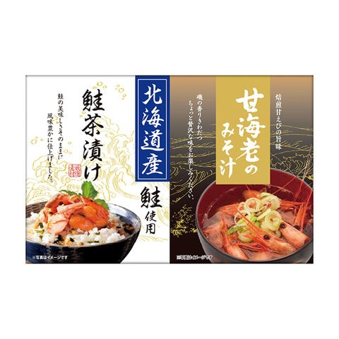■商品紹介内容/甘海老みそ汁:7.5g×2・北海道産鮭茶漬け:4g×2《乳・小麦・えび》
