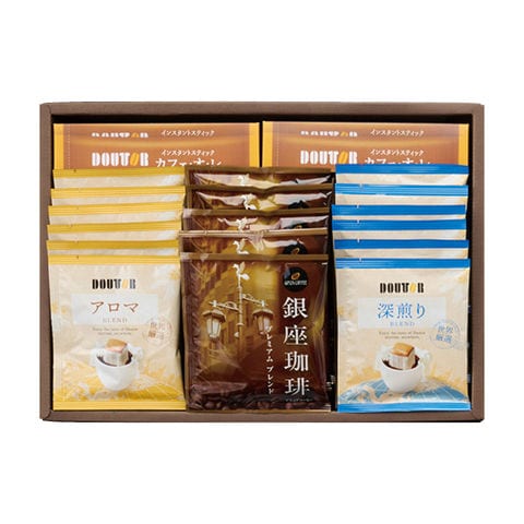 ■商品紹介内容/ドトールドリップコーヒーアロマブレンド:7g×6・ドトールドリップコーヒー深煎りブレンド:7g×6・銀座珈琲プレミアムブレンド:10g×5・ドトールカフェ・オ・レ:9.5g×4《乳》