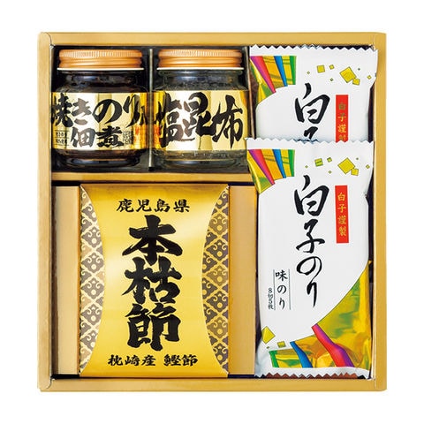 ■商品紹介内容/鹿児島県枕崎産鰹本枯れ節:2.5g×2袋×1・白子のり味のり:8切5枚×2・塩昆布:18g×1・焼きのり佃煮:85g×1《小麦・えび》