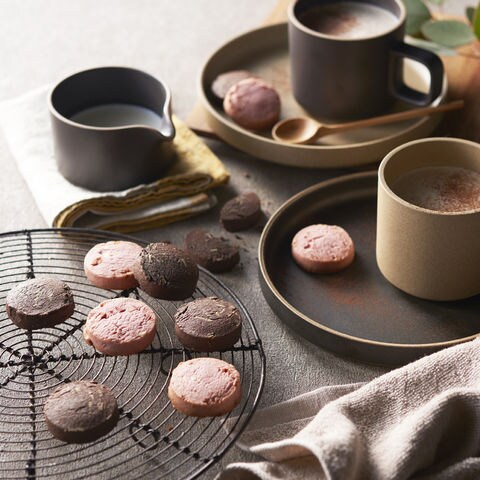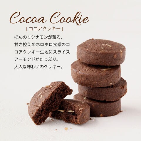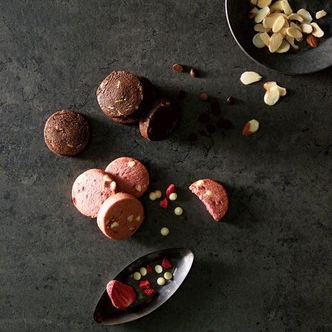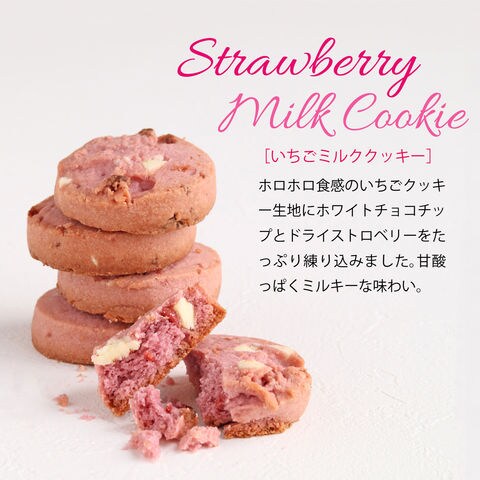 ■商品紹介:ストロベリーミルク味にはホワイトチョコとドライストロベリーを、ココア味にはアーモンドをたっぷり練り込んでホロホロ食感に焼き上げました。