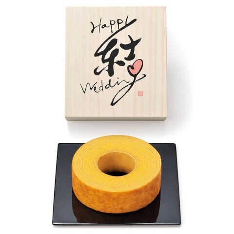 ■商品紹介:「happy Wedding」が結ぶご縁に感謝の思いを込めて贈るギフト。 文字と「想い」が融合したデザイン書が描かれた木箱に、北海道産生クリームが入った、しっとりバウムクーヘンを入れて贈ります。 ■商品内容:セット内容:バウムクーヘン(北海道産生クリーム使用)/1個 箱サイズ:約18×20×h6.5cm 賞味期限:20日 8大アレルゲン:小麦・卵・乳 デジタルカタログはこちら