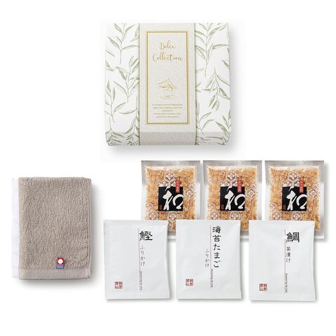 ■商品紹介:ET-15_1.jpg  ■商品内容:セット内容:ウォッシュタオル/1枚(約34×30cm)、かつお節/3g×3袋、鯛茶漬け/6g×1袋、かつおふりかけ/3.5g×1袋、のりたまごふりかけ/3.5g×1袋 箱サイズ:約18×18×h6.5cm 賞味期限:365日 8大アレルゲン:小麦・卵・乳