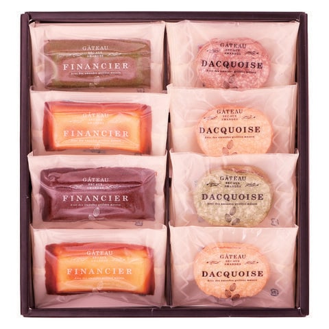 ■商品内容:ダックワーズ×4(プラリネ×2、ショコラ・抹茶×各1)、フィナンシェ×4(プレーン×2、ショコラ・抹茶×各1)