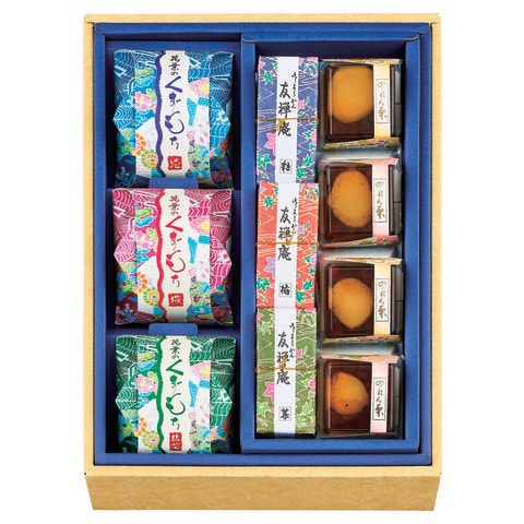 ■商品内容:萬葉のくずもち×3【純・桜・抹茶×各1】、友禅庵ようかん×3【粒・梅・茶×各1】、のれん栗×4