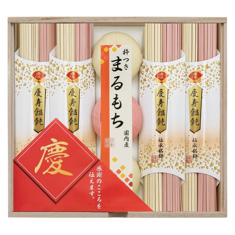 ■商品内容:慶寿うどん(白・紅)×各4束、まるもち(白)30g×2、まるもち(紅)30g×1