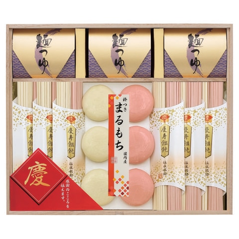 ■商品内容:慶寿うどん(白・紅)×各6束、まるもち(白・紅)30g×各3、麺つゆ30ml×6