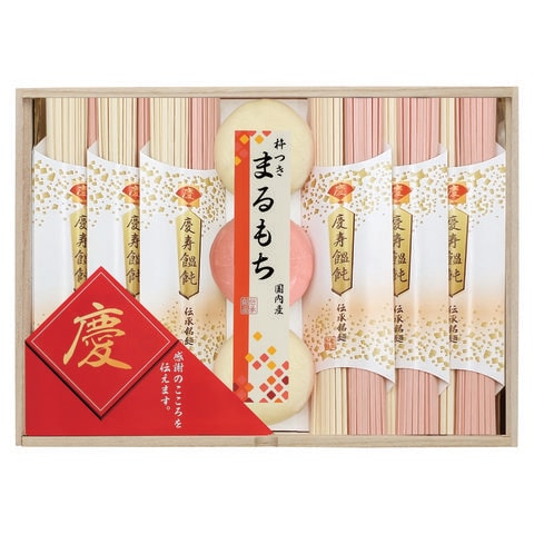 ■商品内容:慶寿うどん(白・紅)×各6束、まるもち(白)30g×2、まるもち(紅)30g×1