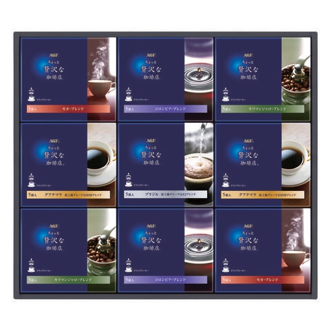 ■商品内容:「ちょっと贅沢な珈琲店」ドリップコーヒー5P×9(グアテマラ最上級グレード豆SHBブレンド、モカ・ブレンド、キリマンジャロ・ブレンド、コロンビア・ブレンド×各2、ブラジル最上級グレード豆#2ブレンド5P×1)