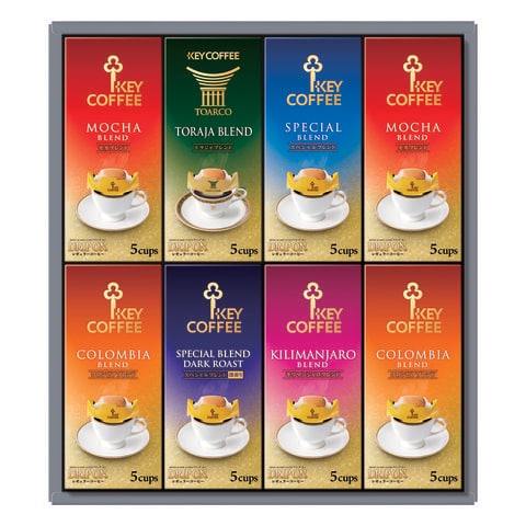 ■商品内容:ドリップオン8g×5袋×7(トラジャブレンド・スペシャルブレンド・キリマンジャロブレンド×各1、モカブレンド・コロンビアブレンド×各2)、ドリップオンスペシャルブレンド深煎り 7.5g×5袋×1