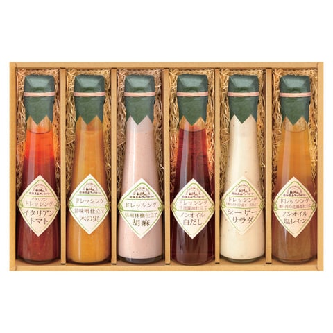■商品内容:イタリアントマトのイタリアンドレッシング120ml×1本、特選醤油仕立てノンオイル白だしドレッシング120ml×1本、甘味噌仕立て木の実ドレッシング120ml×1本、信州林檎仕立て胡麻ドレッシング120ml×1本、2種のイタリア産チーズ仕立てシーザーサラダドレッシング120ml×1本、瀬戸内の花藻塩仕立てノンオイル塩レモンドレッシング120ml×1本