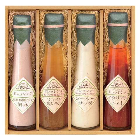 ■商品内容:信州林檎仕立て胡麻ドレッシング120ml×1本、瀬戸内の花藻塩仕立てノンオイル塩レモンドレッシング120ml×1本、2種のイタリア産チーズ仕立てシーザーサラダドレッシング120ml×1本、イタリアントマトのイタリアンドレッシング120ml×1本