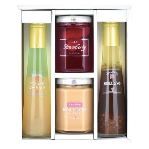 ■商品内容:ジャム×2(いちご145g・ロイヤルミルクティー160g×各1)、ドレッシング122ml×2(フレンチガーリック・和風しょうゆ×各1)