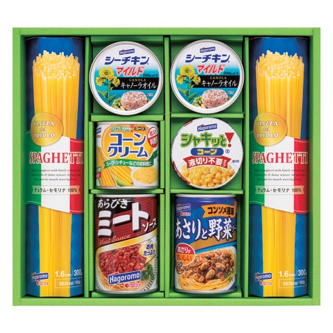 ■商品内容:スパゲティ300g(100g×3束)×2、シーチキンマイルドキャノーラオイル70g×2、シャキッとコーンクリーム180g×1、シャキッとコーン55g×1、あらびきミートソース290g×1、あさりと野菜ソースコンソメ風味290g×1