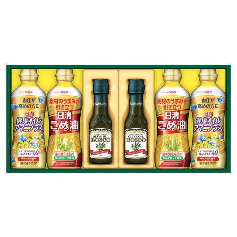 ■商品内容:日清こめ油350g・日清健康オイルアマニプラス・ボスコエキストラバージンオリーブオイル140g×各2