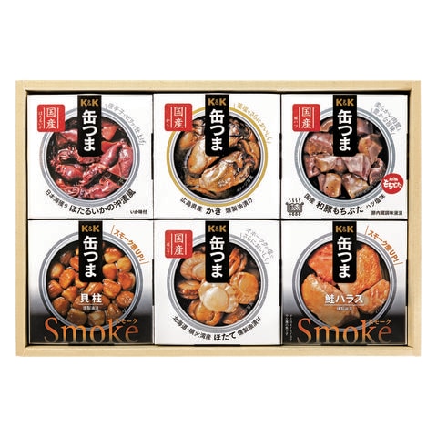 ■商品内容:缶つま×6(ほたて燻製油漬け・ほたるいかの沖漬風・かき燻製油漬け・smoke鮭ハラス・some貝柱・和豚もちぶた ハツ塩味×各1)