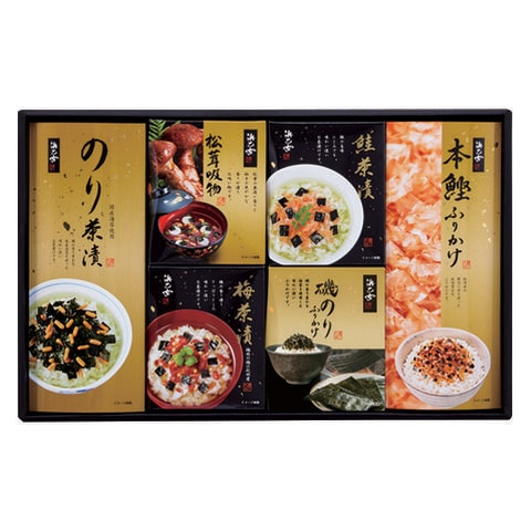 ■商品内容:のり茶漬6g・本鰹ふりかけ5g×各8、鮭茶漬6.4g・磯のりふりかけ5g・梅茶漬6g・松茸吸物3.8g×各5