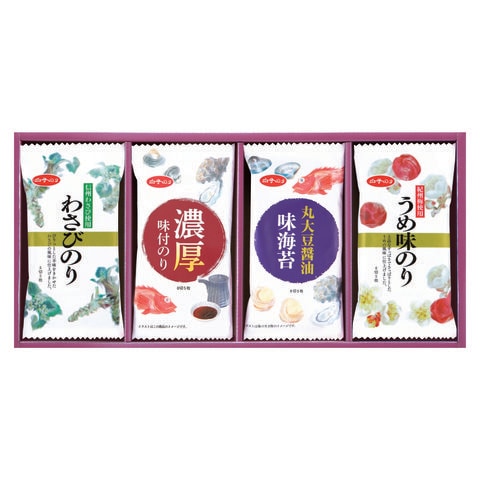 ■商品内容:信州わさび使用わさびのり(8切5枚)・濃厚味付のり(8切5枚)・丸大豆醤油味のり(8切5枚)・紀州梅使用うめ味のり(8切5枚)×各2