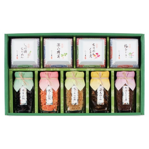 ■商品内容:ちりめん山椒30g、焼き紅鮭43g、海老わかめ65g、牛肉おぼろ煮60g、木耳山椒 55g 、ちりめんくぎ煮50g 、梅ひじき50g 、深山椎茸 60g、しば漬ちりめん50g
