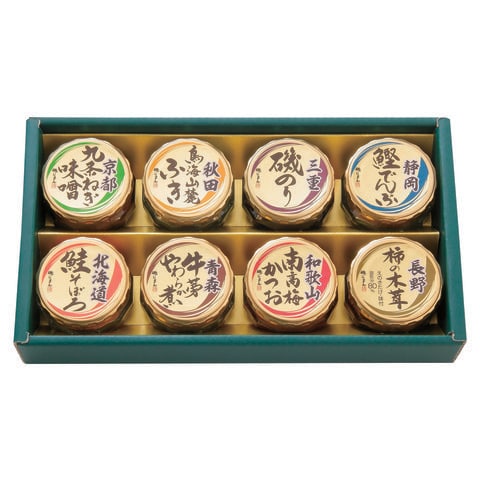 ■商品内容:京都九条ねぎ味噌90g、秋田鳥海山麓ふき45g、三重磯のり90g、静岡鰹でんぶ45g、北海道鮭そぼろ40g、青森牛蒡やわらか煮55g、和歌山南高梅かつお90g、長野柿の木茸85g