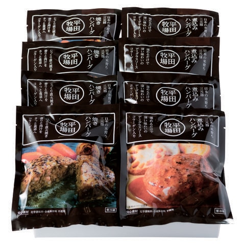 ■商品内容:日本の米育ち三元豚焼きハンバーグ105g×4、日本の米育ち三元豚煮込みハンバーグ130g×4