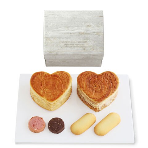 ひとつ一つは愛らしいハート型。ハートが2つで幸せを演出するオリジナリティあふれるギフトです。 ■商品内容:セット内容:ハートのデニッシュパン/2個(メープル・チョコマーブル各1個)、クッキー/2個(いちごミルク・ココア各1個)、ソフトクッキー(カスタード)/2個