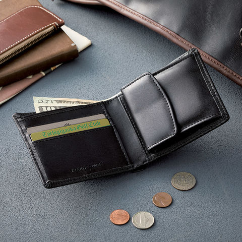■商品紹介:オープン開閉式。札入×2室、ホック式小銭入×1室、カード入×3室、ポケット×3室。ロゴ銀箔押し。