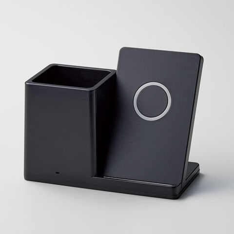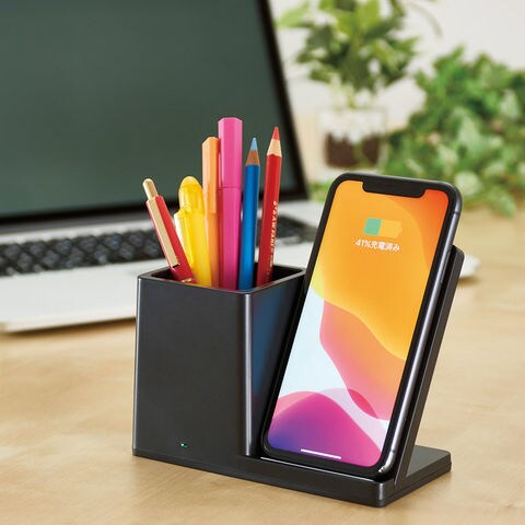 ■商品紹介:qi対応のスマートフォンを置くだけで充電が出来る、便利なペンホルダーの付いたワイヤレス充電器です。背面にUSBポートも1つ付いており、ワイヤレス充電に対応していないスマートフォン等も充電可能です。USBポート・USBコード・ペンホルダー付。