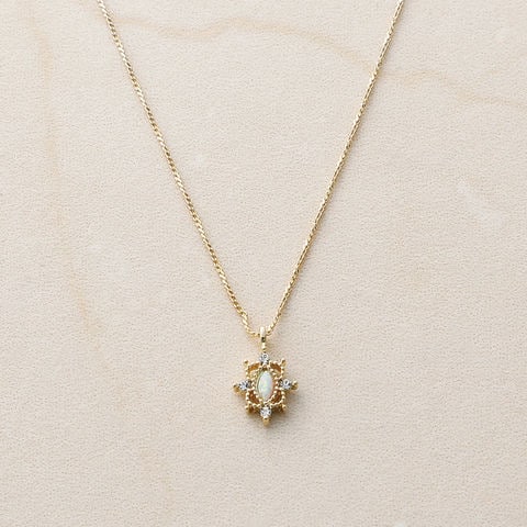 ■商品紹介:透かしデザインの繊細なネックレス。オパール風のモチーフとガラスが優しく輝きます。