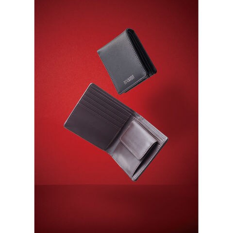 ■商品紹介:オープン開閉式。札入×2室、ホック式小銭入×1室、カード入×4室、フリーポケット×3室。ロゴ箔押し。
