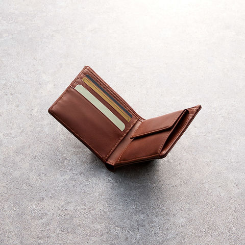 ■商品紹介:素材に風合いがありとても機能的な折財布です。二つ折開閉式。札入×2室、ホック式小銭入・外オープンポケット×各1室、カード入×4室、オープンポケット×3室。
