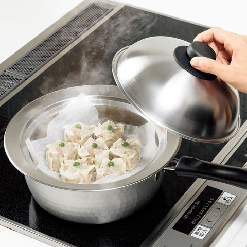 ■商品紹介:お持ちの鍋に乗せるだけで、手軽に蒸し物ができるスチームプレートです。温野菜やシュウマイ、中華まんに。鍋18~20cm用。