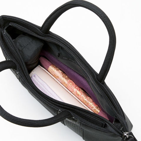 ■商品紹介:軽い素材で出来たフォーマルバッグです。前面の格子柄がエレガントな印象を与えます。ファスナー開閉式。外マグネット付ポケット×1室。持ち手立上り約12cm。