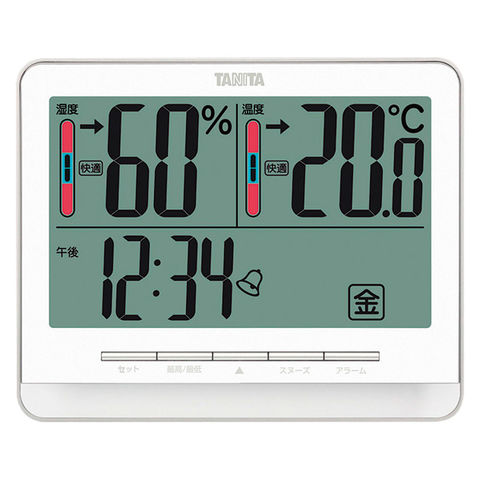 ■商品紹介:温度・湿度の快適レベルを5段階でお知らせ。過去の最高・最低温湿度を表示。時計機能(スヌーズ機能付)、測定範囲:温度-5.0~45.0度/湿度20~95%、一目盛:温度0.1度/湿度1%。お試し用単4乾電池2本付。