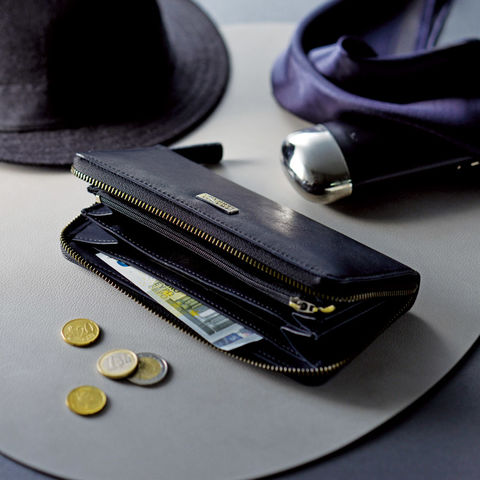 ■商品紹介:素材の風合いも凝った収納性のあるラウンドファスナー長財布です。札入×2室、ファスナー式小銭入×1室、カード入×8室、内ポケット×3室。