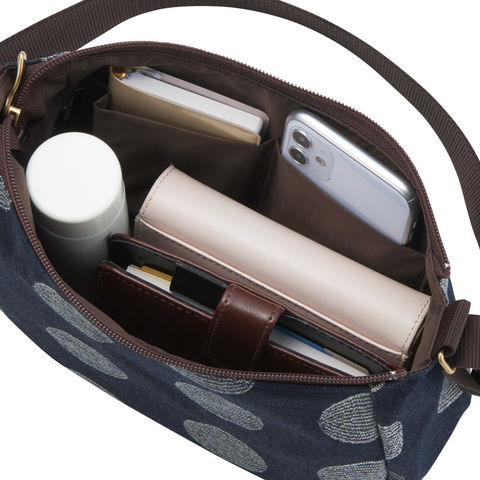 ■商品紹介:日本のデニムの聖地と言われる岡山県井原産デニムを使用したショルダーバッグです。ラメ糸を織り込んだデニム地は上品な輝きがあります。ファスナー開閉式。内ファスナーポケット×1室、オープンポケット×2室。ショルダーベルト着脱不可(長さ調節可)。