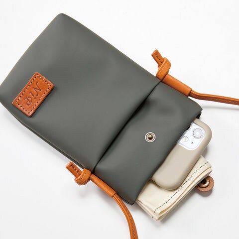 ■商品紹介:スマホやミニ財布、リップなど必要最低限の持ち物が収納できます。素材には環境配慮型ポリウレタンを使用。耐水性があり、軽くてソフトでキズ付きにくいです。牛革は栃木レザー・姫路レザーのタンニン鞣しのヌメ革を使用しています。ベロ付ホック開閉式。外オープンポケット×1室。ショルダーストラップ(着脱可・長さ調節可)付。