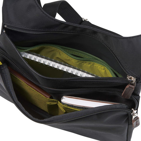 ■商品紹介:使い勝手の良いシンプルなショルダーバッグ。日本製で、裏地には抗菌防臭加工の素材が使用されています。内ファスナーポケット×1室、オープンポケット×2室、ペン差×2室、背面オープンポケット×1室。ショルダーベルト着脱不可(長さ調節可)。