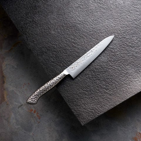 ■商品紹介:刀身は食材の繊維を壊さずうま味を逃さない極上の切れ味。ハンドルは気品ある槌目模様で深みある銀の色調。槌目の上に滑りにくい加工を施しています。さらに中を空洞にしたモナカ柄にすることで軽さも両立しました。